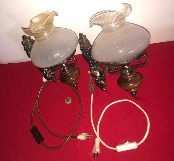 • Arandelas de parede antigas, feitas de metal trabalhado com cúpulas de vidro opalina.