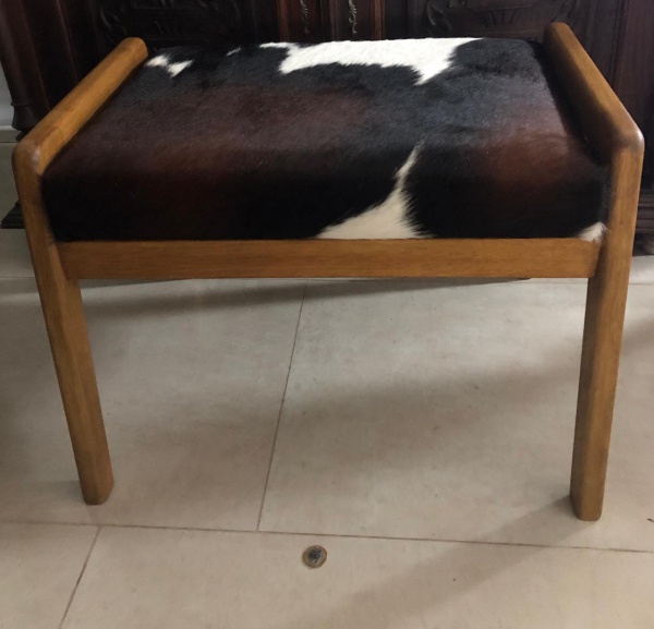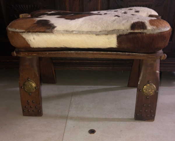 • Banco baixo  com assentos feito de couro legítimo com pelo bovino e estrutura em formato de x feito de  madeira de alta qualidade com medalham feito em latão.
