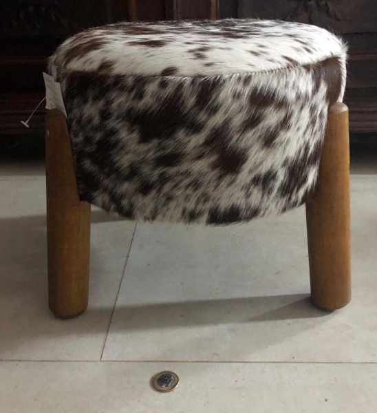 • Puff Barril pequeno feito de couro legítimo com pelo bovino com pés em madeira.