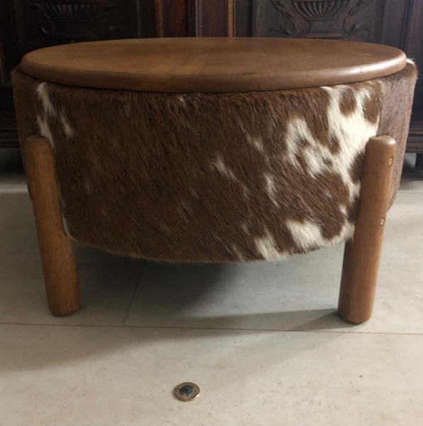 • Mesa de centro feito de couro legítimo com pelo bovino com pés e tampa em madeira.