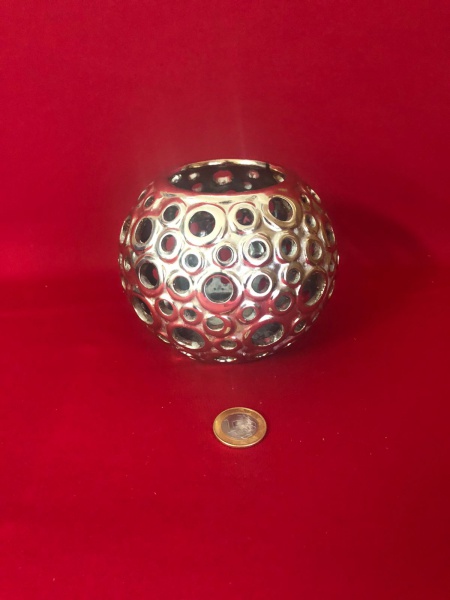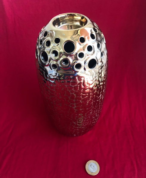 • Vaso decorativo de cerâmica com acabamento metálico.