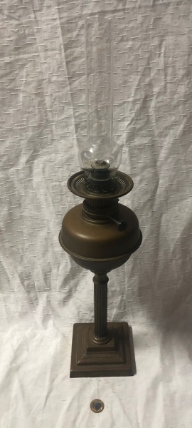 • Candeeiro a óleo antigo identificado pela marca "Young's" do modelo Central Draught  feito na Grã-Bretanha data predominantemente da década de 1880, durante a era vitoriana. Chaminé feita de cristal de boêmia e corpo em bronze