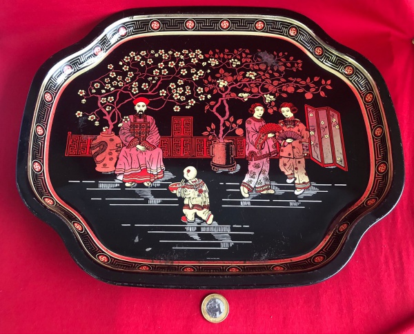 • Bandeja Chinoiserie Elite de metal preto vintage, da The Metal Tray Mfg Co, fabricada na Inglaterra, para servir, decoração de casa, presente .