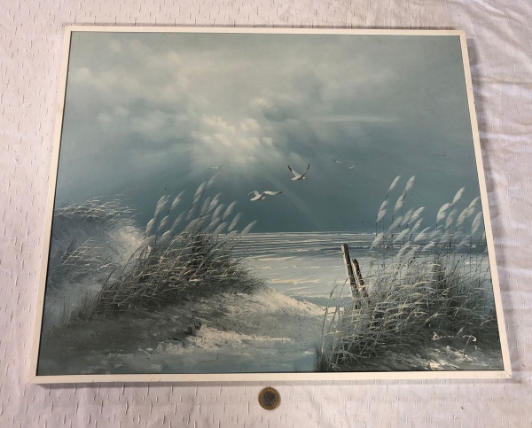 • Pintura a óleo sobre tela, estilo paisagem marítima impressionista feita num ateliê de arte comercial Dunlop com moldura feita na Holanda pela Passepartout Lijstenhandel b.v  com tamanho 61,5cm x 51,5cm .