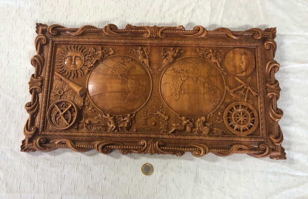 • Painel decorativo de parede esculpido em madeira com um design de mapa-múndi estilo 3 D