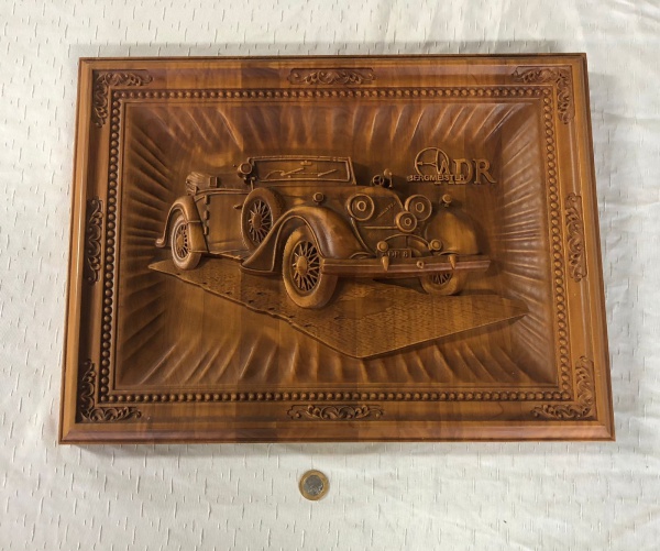• Painel decorativo de madeira entalhada representando um carro antigo no estilo 3D.