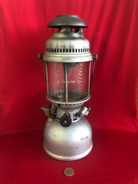 • Lampião antigo a querosene da marca  Hipólito  modelo H-502 Automático fabricado em Torres Vedras, Portugal, pela Casa Hipólito S.A entre as décadas de 1950 a 1970.
