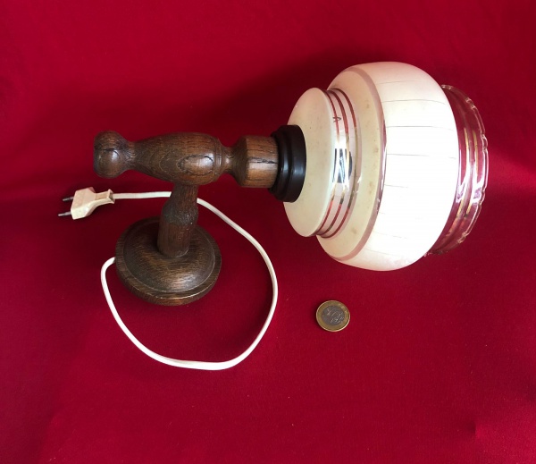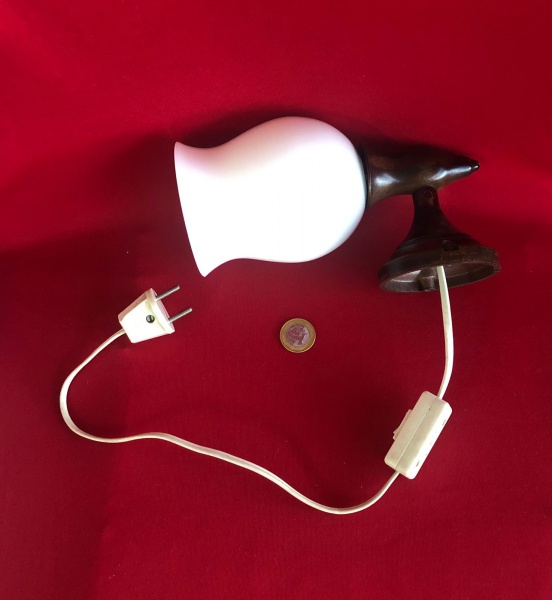 • Arandela de parede vintage com cúpula feita em vidro opalino e base em madeira torneada  estilo da década de 1950 .