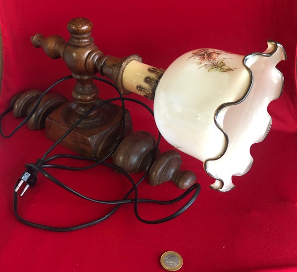 • Arandela de parede vintage, caracterizada por seu estilo clássico e base de madeira torneada com cúpula em Vidro opalino com borda ondulada  das décadas de 1970 e 1980 .