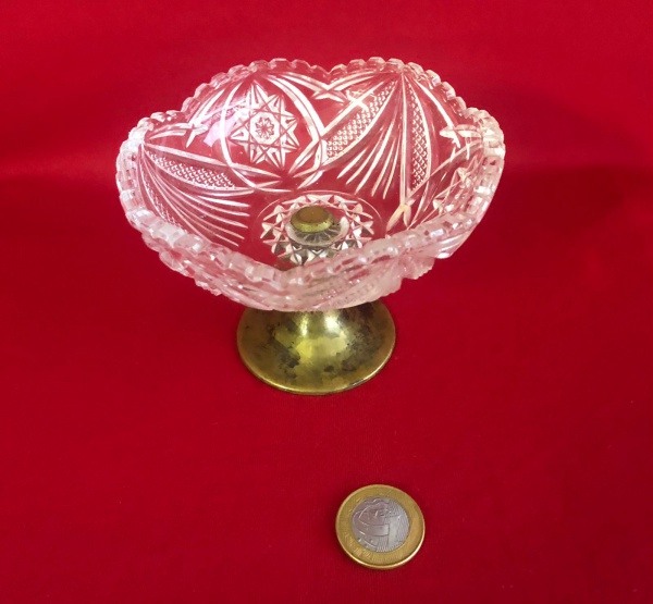• Centro de mesa antigo em cristal lapidado, montado sobre uma base de metal .