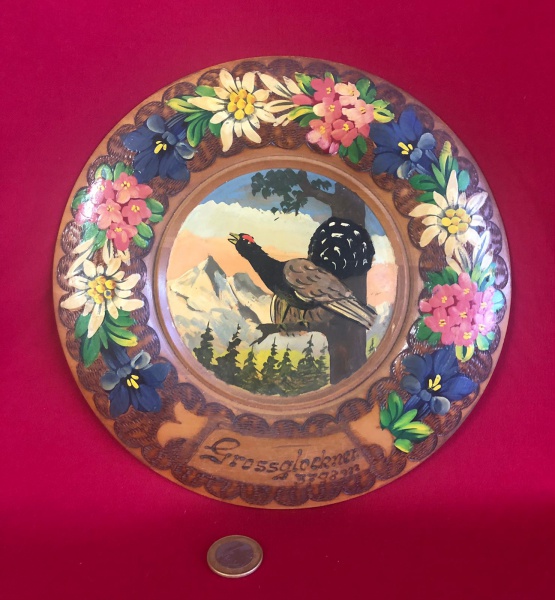 • Prato de parede entalhado e pintado à mão feito de madeira no estilo das décadas de 1950 a 1970  na Áustria.